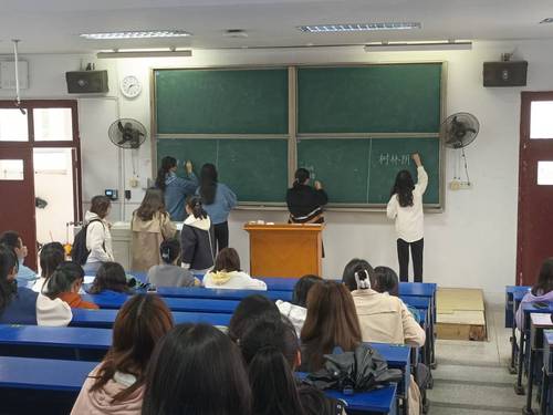 此次比赛分为钢笔字、粉笔字和毛笔字三个板块,其中钢笔字已经由各班学委收齐并上交。首先,主持人宣布比赛规则、此次比赛的目的及意义并宣布比赛正式开始。之后,参加粉笔字的同学按照名单顺序,四人一组到黑板上进行书写。与此同时,毛笔字比赛也一并展开。此次比赛的参赛选手书写十分流畅,字体具有特色,选手们也注意到从笔法、字法和章法三个方面提升和完善书写。最后,主持人宣布比赛结束,参赛选手先行离场,评委在对毛笔字评分完毕后离场。