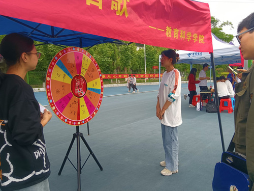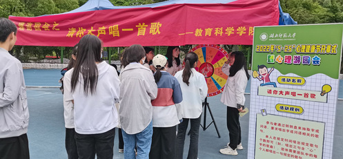 活动伊始,由心理中心的老师上台致辞,并宣读活动规则。之后,参与者进行各种游戏活动赢得奖品。如:参与者通过转转盘来抽取字或词语,在规定时间内唱出规定歌句个数即可获得奖励。在活动进行过程中,许多同学积极参与、尽情歌唱,大家自觉排队,活动进行得火热且有序。整个过程中充满了欢声笑语,空气中弥漫着轻松活泼的气氛。