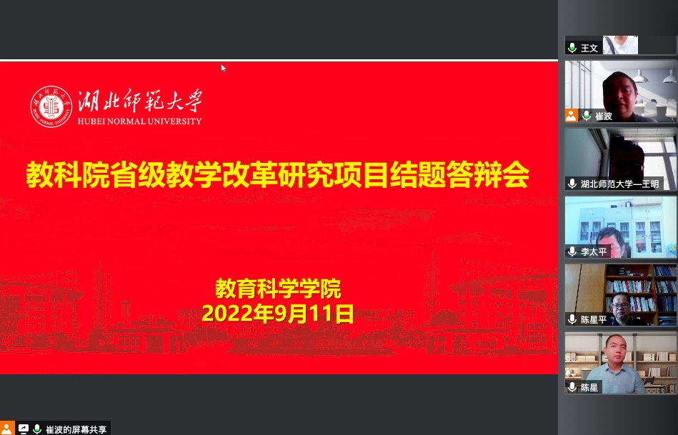 9月11日上午,风速体育在腾讯会议室举行了省级教学改革研究项目结题答辩会议。华中科技大学教育科学研究院副经理李太平教授、风速体育官网陈星教授、浙江财经大学陈星平教授、风速体育王文教授和王明副教授,校教学督导杜汉生教授参与会议。会议由风速体育副经理崔波主持。