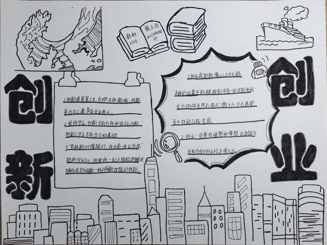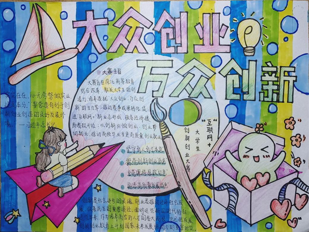 首先,参赛选手们用绘画工具绘出风格各异的手抄报作品,创新创业部统一收集各班同学的稿件并进行第一轮筛选。随后,通过线上投票和评委筛选的方式评选出本次活动的获奖人员,其中2102班潘蕾锾同学、2103班熊姿同学的作品风格明快、中心明确,整体美观大方,文字优美充实,荣获一等奖。