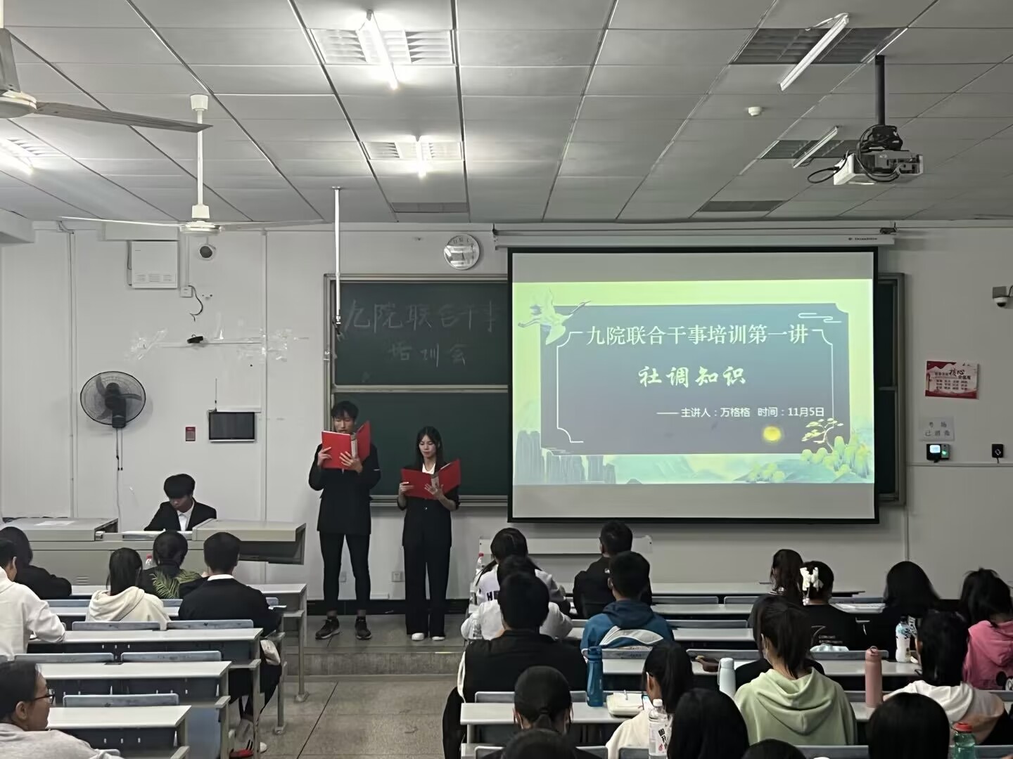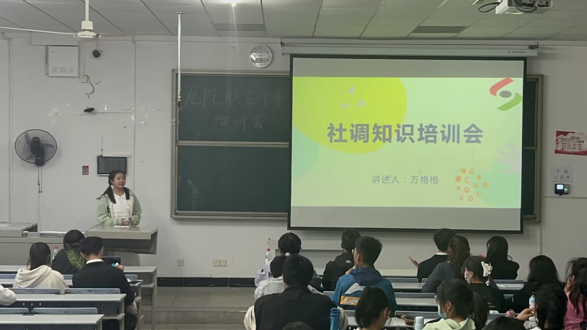 为了丰富各院社会实践调查大队见习干事们的理论知识,九院联合干事培训第一讲于2022年11月5日下午在科技大楼9401举办。本次培训由体育学院主办,校社调中心副秘书长万格格和特邀嘉宾周定通受邀参加本次培训,九院见习干事参加了此次培训。