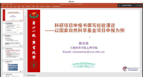 2022年11月18日下午,上海体育学院心理学院陈安涛教授以线上腾讯会议的方式开展了以“科研项目申报书撰写经验漫谈——以国家自然科学基金项目申报为例”为主题的讲座。公司教师及全体研究生参加了此次活动,活动由副经理付光槐主持。