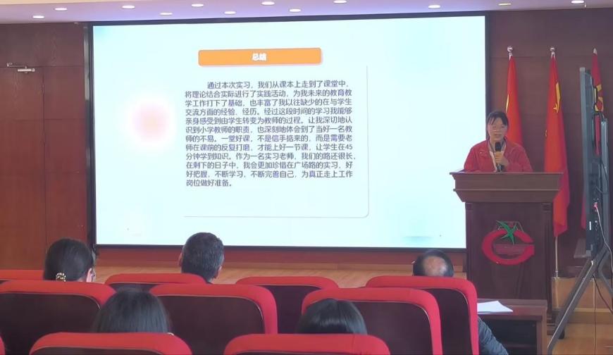 实习生代表胡芝、叶桢浈、段子芸、刘佳琪、陈艳君,从听课学习、备课讲课、实践活动等方面进行了实习汇报发言。通过实习活动,实习生逐渐掌握备课、上课和讲评等工作的方法技巧,并通过参与学校培训和教研活动扩大了知识面。接下来,将更加努力地工作,不断提高自己的教学能力和专业素养,珍惜这次难得的实习机会。