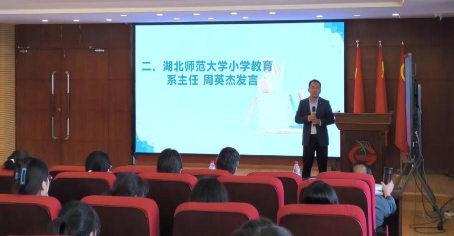 小学教育系主任周英杰发言,对实习员工提出了“三个感恩”:感恩老师、感恩员工、感恩学校;做到“三个不负”:不负老师的教诲、不负珍贵的时间、不负社会国家对我们的期待。
