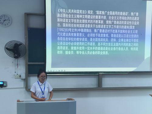 首先,两位主讲人简单地向同学们讲解了普通话的含义,指出汉语不等同于普通话,讲述了普通话的来历以及推广普通话的意义主要是为了消除方言隔阂,推动社会交流。随后,通过语委办发布的两个法律政策向同学们强调学习普通话的重要性。以及往后想要从事工作时哪些工作对于普通话有哪些相关要求。在会议最后,主讲人详细地介绍了国家有关普通话的政策法规以及学校在普通话方面作出的相关要求。