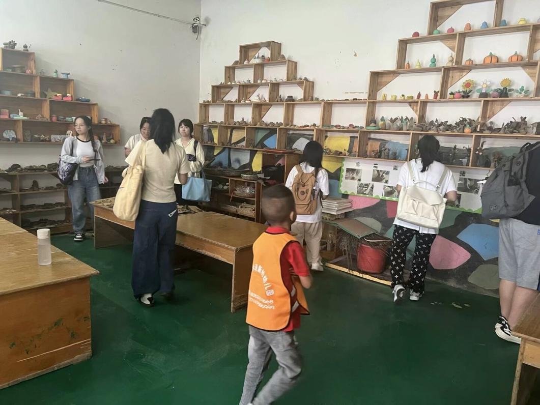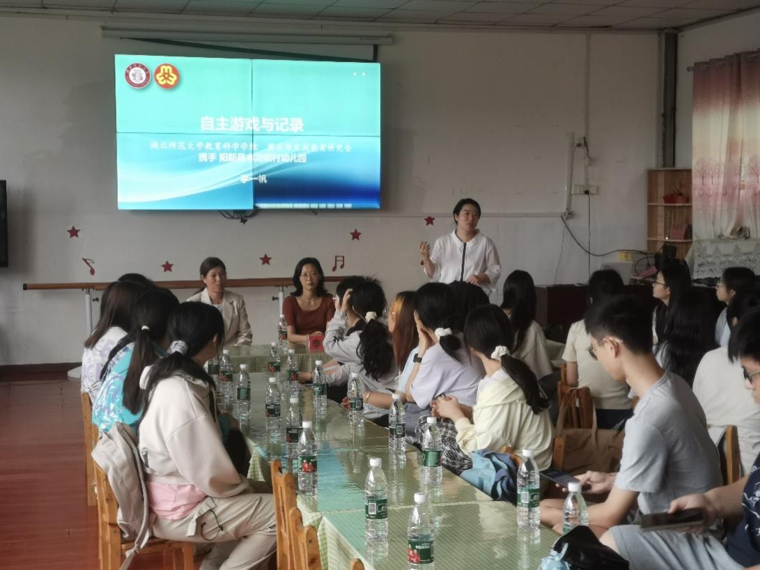 同学们先是参观了幼儿园特色泥工坊,了解到幼儿园从本地资源出发,挖取并比较本地黄土和黑土特色形成独特的泥工作坊。其次,同学们兴奋地参与了幼儿的竹竿舞,了解幼儿园就地取材,取用当地常见的竹子作为游戏材料。随后,同学们参观完幼儿园户外场地后分散进入班级听课。最后,钟园长与学前教育系教师为幼儿园老师和同学们带来关于教育情怀熏陶、自主游戏与记录相关主题的研讨。
