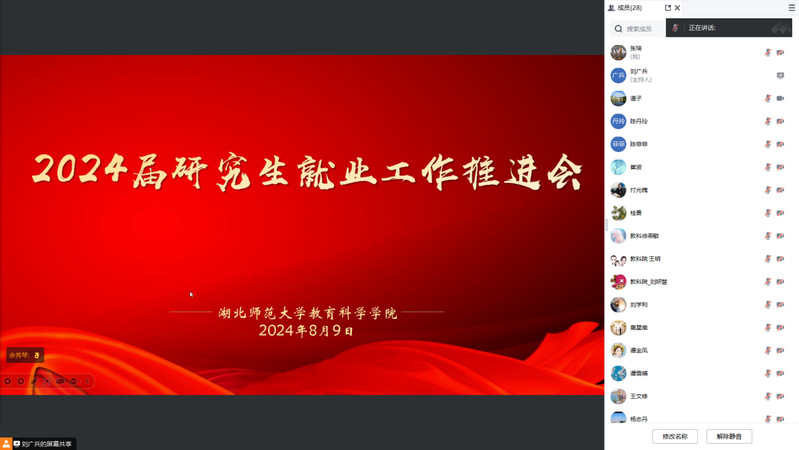 党委副书记刘广兵通报了2024届研究生整体就业情况,并细化后续工作目标任务。副经理崔波重点强调了研究生就业工作与团队建设和人才培养的重要关系。研究生院副经理周英杰分析了全校研究生就业形势,重申了学校将研究生就业工作纳入年度考核体系的相关要求,强调导师要进一步加强对研究生就业工作的重视,全力指导帮助研究生求职择业。