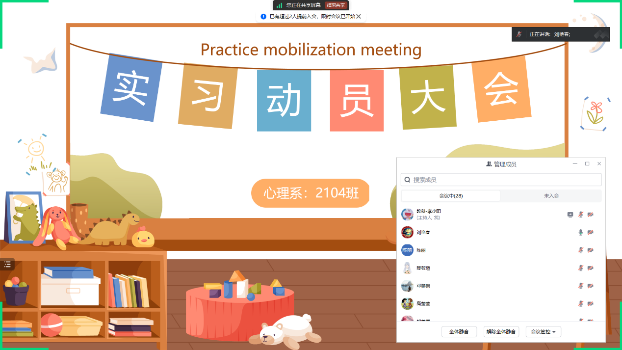 2024年9月5日下午6时,心理系2104班开展了实习动员大会,出席此次会议的有学工处副处长兼心理系2104班班主任邓黎崇老师、心理系系主任刘艳春老师以及心理系2104班全体同学。