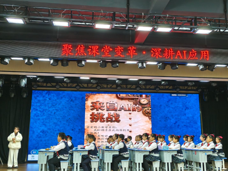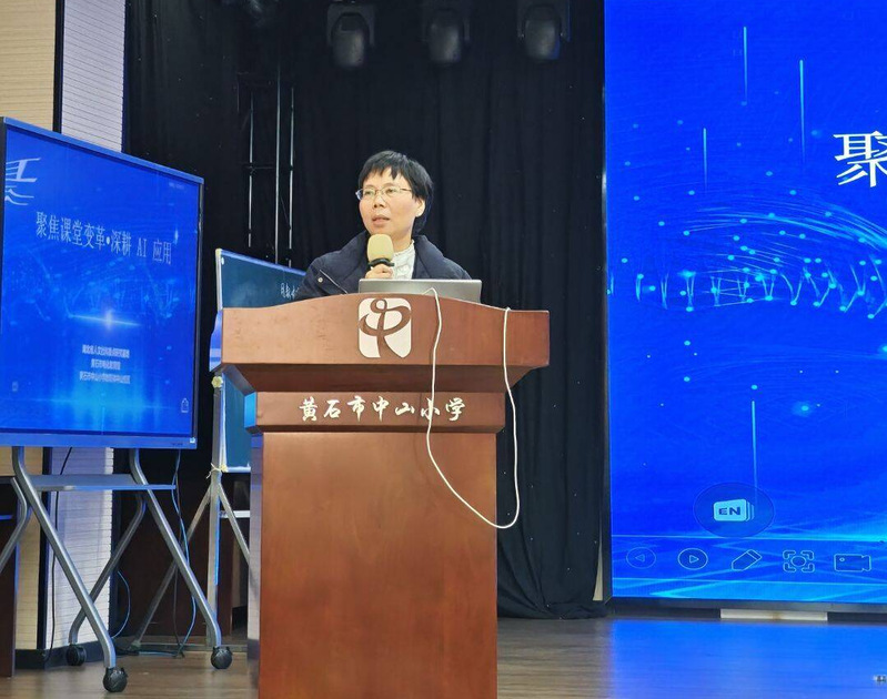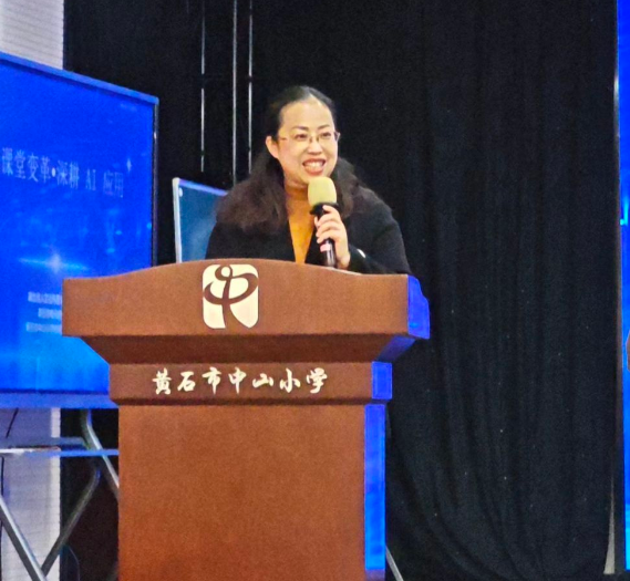 活动伊始,中山小学邓莉萍董事长致辞并简要汇报了中山小学作为黄石市唯一一所教育部批准的人工智能实验基地,始终深耕AI应用探索教学新范式,并呼吁与会者要聚焦课堂变革的核心任务。随后,数学教师吴紫君以《用数对确定位置》为例进行课堂展示,生动展示了人工智能技术在激发学习兴趣、促进知识内化方面的创新实践,并真实呈现了人工智能作为第三维教学视角的存在。吴老师在课后反思中,提到了“智慧空间小博士”任务挑战、五子棋对弈、锤子捶地鼠游戏等AI情景化互动的做法非常适合教师在日常教学中进行创新。