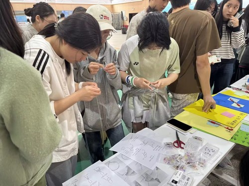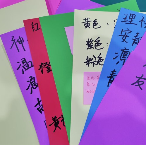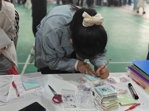 首先,同学们领取情绪色彩卡,写下自己对不同色彩的情绪联想,并在其上用便利贴附上对自己的祝福或鼓励话语。接着,同学们按现场教程自由编织绳结,在编织过程中可抽取盲盒回答一些关于色彩情绪、节气养生的相关问题,答对可获得小挂饰点缀绳结。活动中参与者通过手工编织的沉浸式体验和集体互动的形式,转移焦虑、烦躁等负面情绪,实现情绪的自我调节。